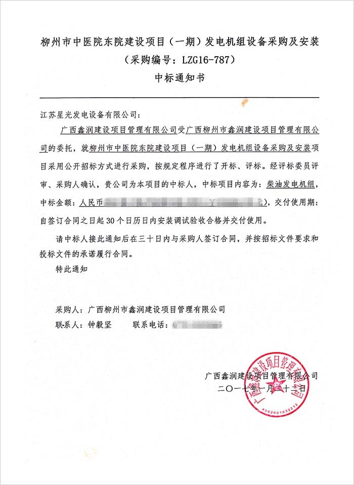 2017年2月21日,我公司传来中标喜讯,收到柳州市中医院东院的中标通知书。中标机组品牌为:里卡多柴油发动机配星光发电机,功率为800KW.我公司将于30天内与该用户签订合同,并按照招标文件要求和投标文件的承诺履行合同。交付使用期为自签订合同之日起30个日内安装调试验收合格并交付使用。