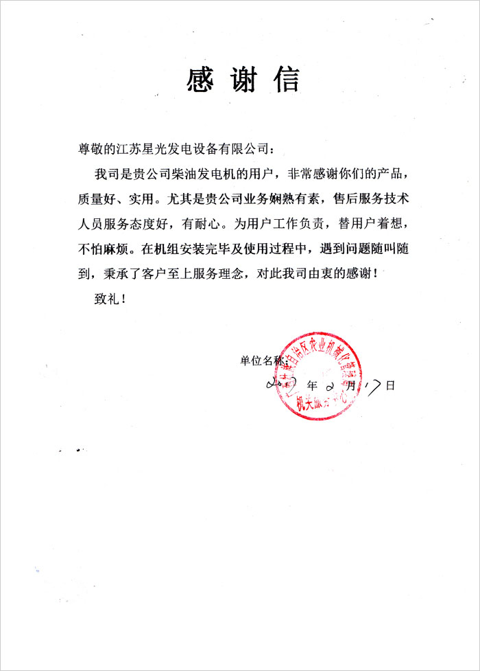 2月17日,我公司很荣幸收到广西壮族自治区农业机械化管理局机关服务中心的感谢信。信中提到我们公司的售后服务技术人员服务态度好,有耐心。对用户工作负责,替用户着想,在发电机组安装完毕及使用过程中,遇到问题能够及时解决。该单位对我公司的售后服务给予了充分肯定。我公司将继续秉承“客户至上”的服务理念,“以诚待人,以心换心”,为用户提供更优质的产品及服务。