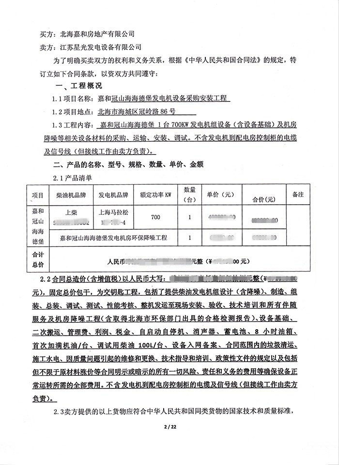 8月21日,我公司和北海嘉和房地产有限公司签订嘉和冠山海海德堡发电机设备采购安装工程合同。按照合同约定,我公司为其提供700KW上柴发电机组一台,配置为上柴柴油机配上海马拉松发电机,包含机房环保降噪工程设计、机组安装、调试、验收、技术培训等服务。