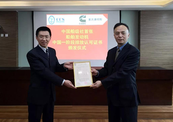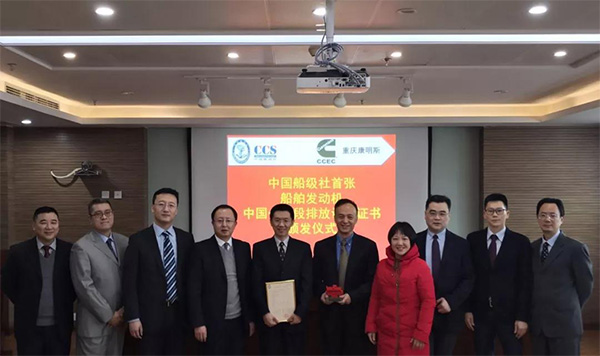 1月10日下午,中国船级社(CCS)向重庆康明斯发动机有限公司(简称“重庆康明斯”)颁发了国内首份船舶发动机中国第一阶段排放认可证书,这标志着国内船舶行业在践行绿色航运理念方面迈出了新的步伐。