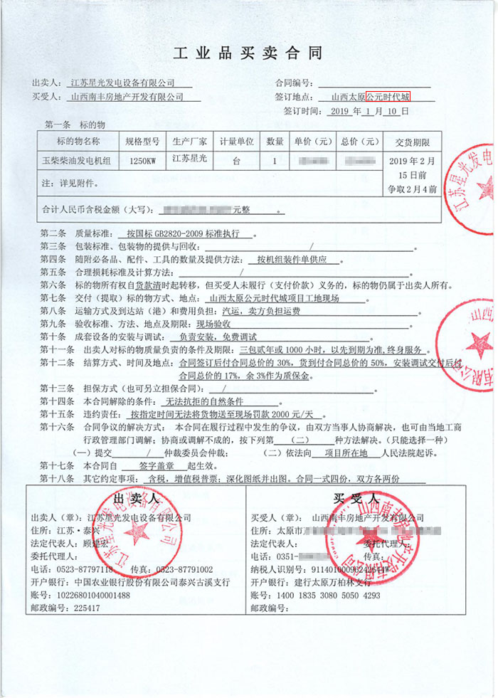 我公司成功签订山西南丰地产公司公元时代城项目1250KW玉柴发电机组一台