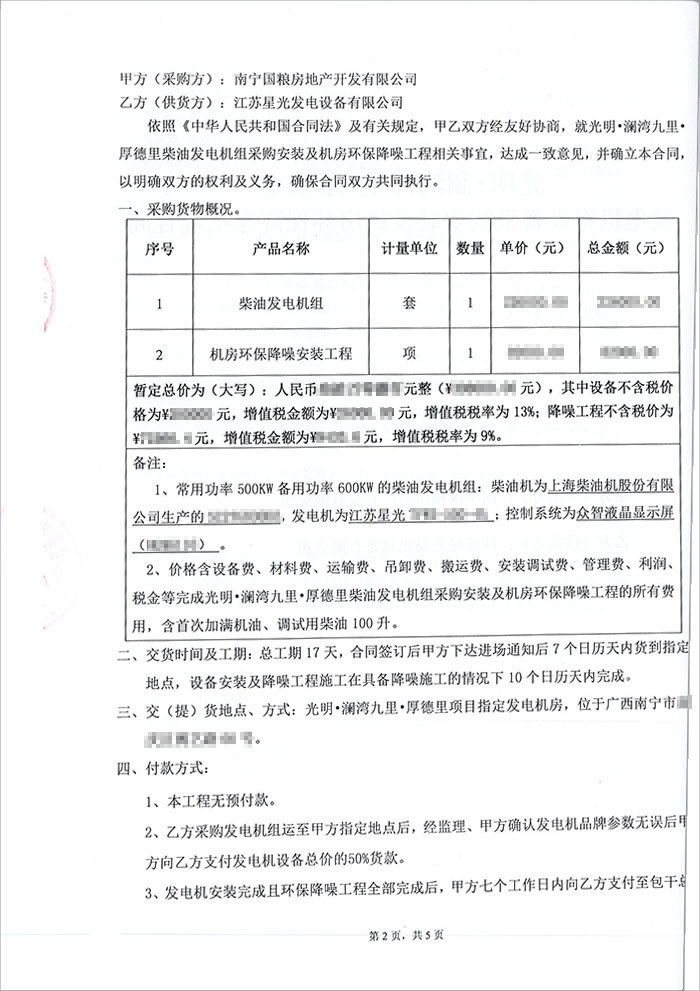 近期,我公司和南宁国粮房地产开发有限公司成功签订一台500KW上柴柴油发电机组,该机组用于光明·澜湾九里·厚德里项目备用电源。此外,我公司还负责机房环保降噪安装工程。据了解,这是国粮地产和我公司的第四次合作,自2015年起,已在我公司购买400KW-800KW柴油发电机组累计达五台。