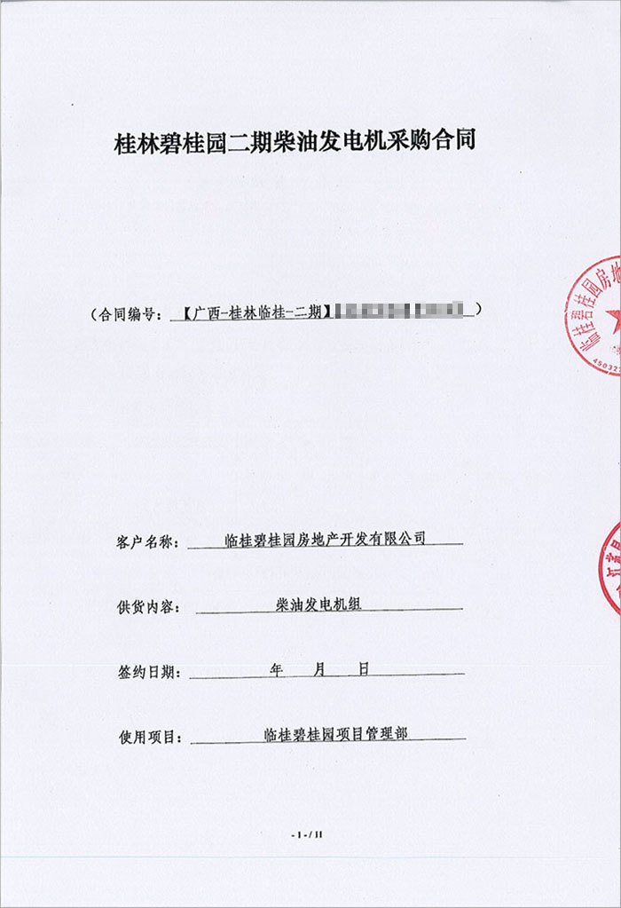 近日,我公司和碧桂园集团旗下临桂碧桂园房地产开发有限公司成功签订两台600KW上柴柴油发电机组,该机组用于临桂碧桂园项目管理部备用电源。