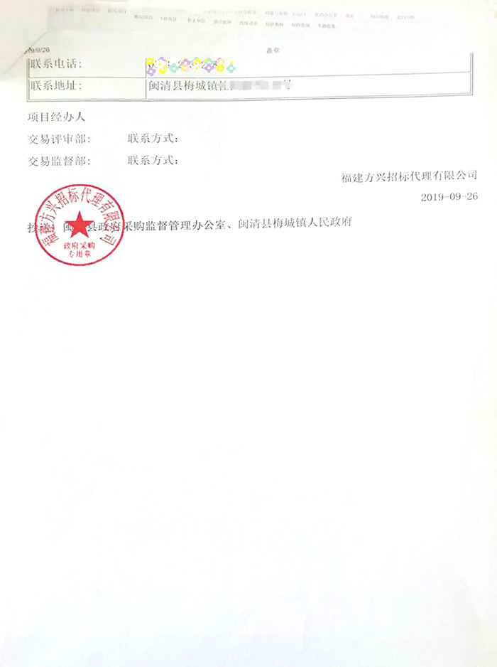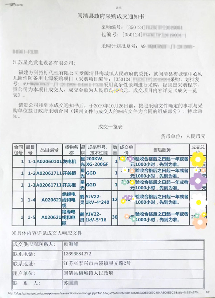 近日,我公司收到福建方兴招标代理有限公司为我们发来的关于闽清县政府采购成交通知书,文中提到其受闽清县梅城镇人民政府的委托,就闽清县梅城镇中心幼儿园消防备用电源采购项目采用竞争性谈判进行采购,经规定采购程序,确定我公司为该幼儿园200KW柴油发电机组采购项目的成交人,并要求我公司接到本成交通知书后,于2019年10月26日按照采购文件确定的事项与采购单位签订政府采购合同。