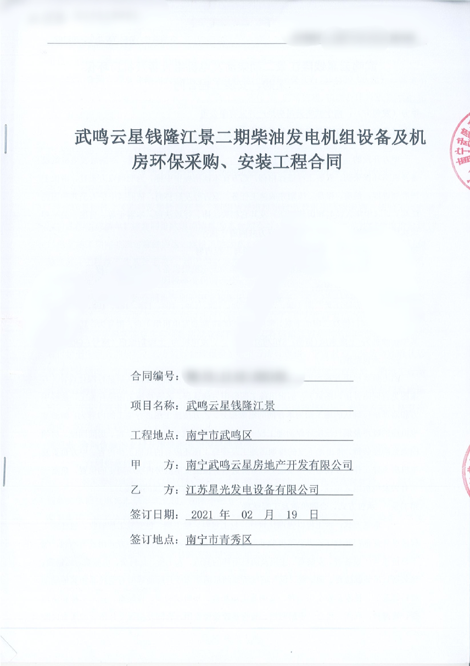 2021年2月19日,江苏星光发电设备有限公司与南宁武鸣云星房地产开发有限公司再次成功签订了一台600KW型号为XG-600GF柴油发电机组,其中柴油机为上海东风(型号SYG283TAD72),发电机为上海斯坦福(型号GR355G),该机组用于的是武鸣云星钱隆江景二期。