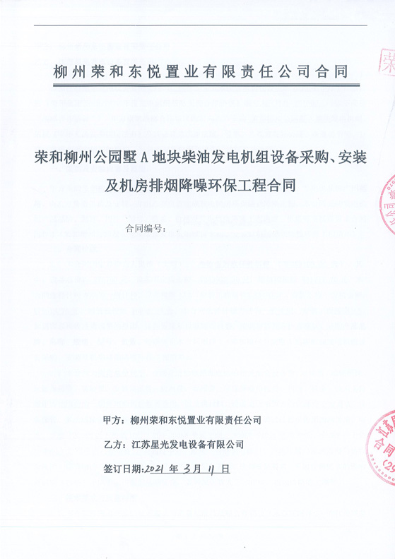 2021年3月11日,江苏星光发电设备有限公司与荣和·柳州公园墅A地块签订一台580KW柴油发电机组,其中发动机为型号WD287TAD61L无锡动力EG355-600N英格发电机,该机组用于荣和·柳州公园墅A地块。我司将在约定时间内负责供货及安装,并且完成发电机房环保隔音降噪工厂。