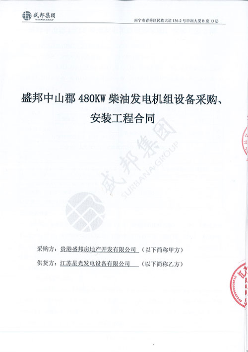 2020年3月31日,我司与盛邦中山郡签订了一台480KW的上柴发电机组,型号SC27G755D2发动机配江苏星光,这次我们也会在合同规定时间内完成机房降噪、排烟、环保工程,确保工程设计及施工质量要求符合国家相关技术要求和施工验收标准、规范及规程。