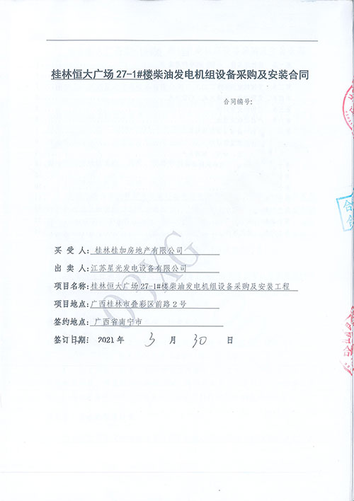 3月30日,江苏星光发电设备有限公司与桂林恒大广场项目签订一台330KW上柴柴油发电机组,上柴柴油机具备以下优势:可靠性好、寿命长,特别适合严酷的使用环境;动力性能好,扭矩储备大;燃油消耗率和机油消耗率低;配套适应性好,可充分满足各类用户的配套需要。设备质量满足国家相关行业的质量标准,并具有国家认可机构检验质量合格报告。