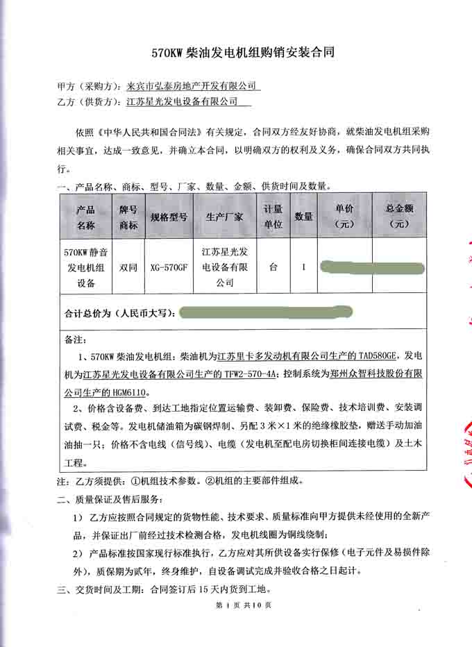 2016年6月21日,来宾市弘泰房地产开发有限公司与我公司签订570KW柴油发电机组采购销安装合同,我公司为其提供570KW静音发电机组设备一台,机组配置为江苏里卡多发动机配星光发电机及众智控制器。我公司负责机组的运输、安装调试及操作人员的技术培训。发电机产品购销合同如下: