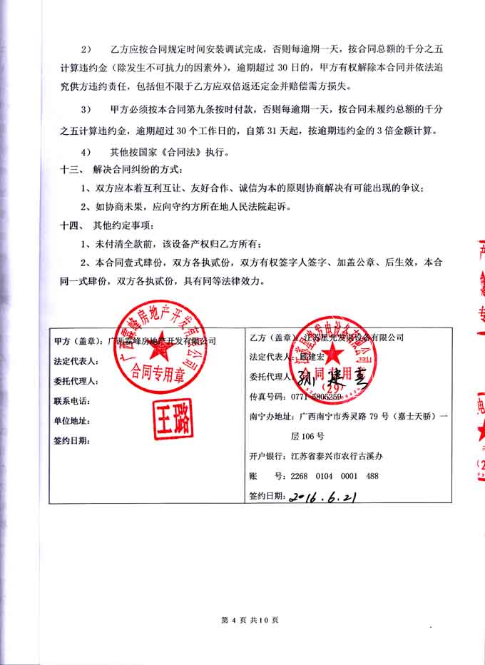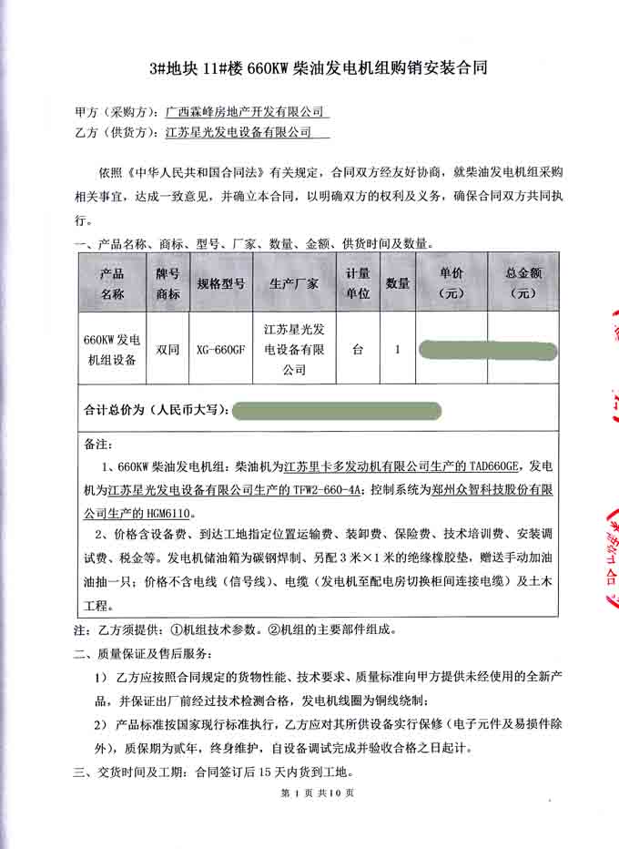 2016年6月21日,我江苏星光发电设备有限公司成功与广西霖峰房地产开发有限公司签订3#块地11#楼660KW柴油发电机组购销安装合同,我公司为其提供一台发电机组配置为为江苏里卡多发动机配星光发电机和众智控制器。发电机产品购销合同如下: