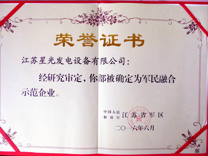 江苏星光发电设备有限公司被评为“军民融合示范企业”