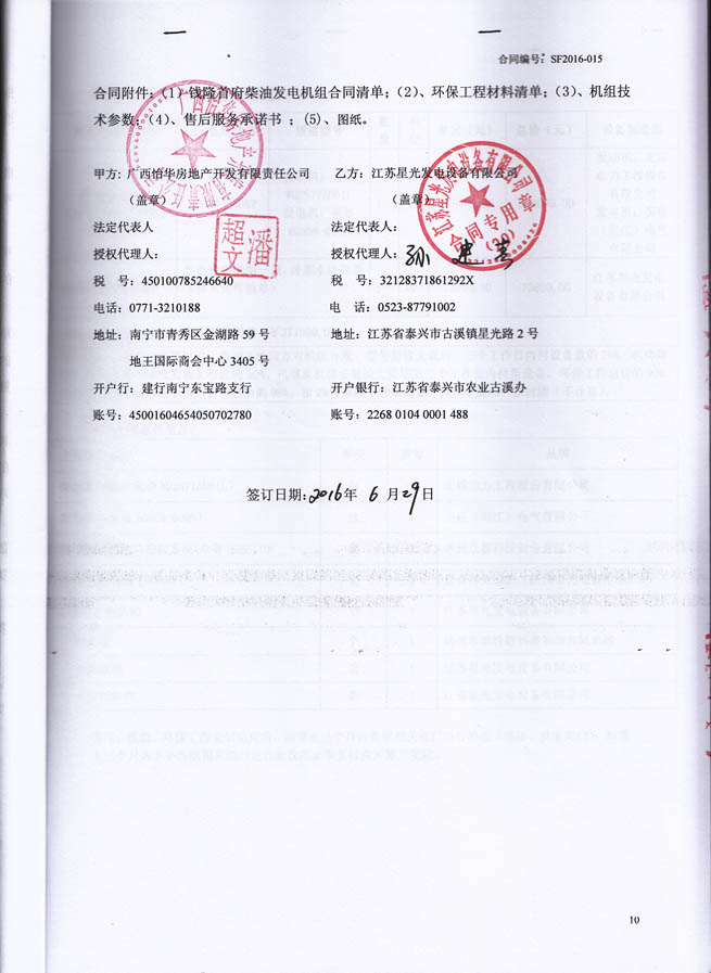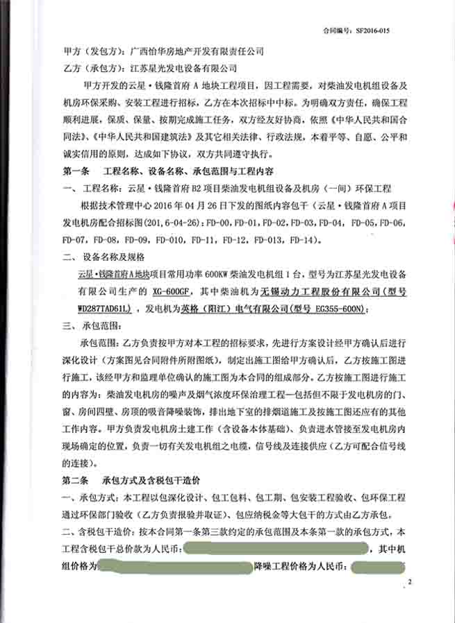 2016年6月29日,广西怡华房地产开发有限责任公与我公司签订云星?钱隆首府A块地(1号楼、2号楼、5号楼、6号楼)柴油发电机组设备及机房环保采购、安装工程合同,我公司为其提供常用功率600KW柴油发电机组1台,型号为我江苏星光发电设备有限公司生产的XG-600GF,其中柴油机为无锡动力工程股份有限公司(型号WD287TAD61L),发电机为英格(阳江)电气有限公司(型号EG355-600N)。