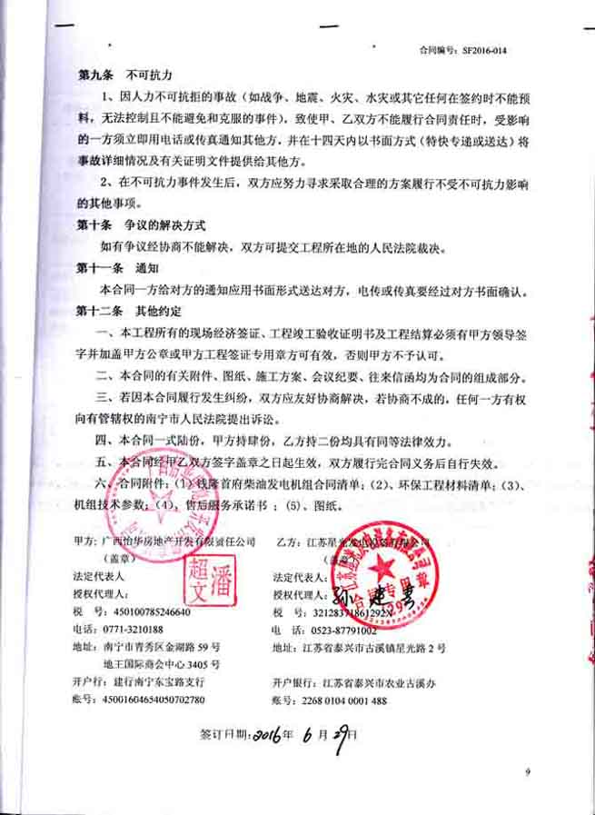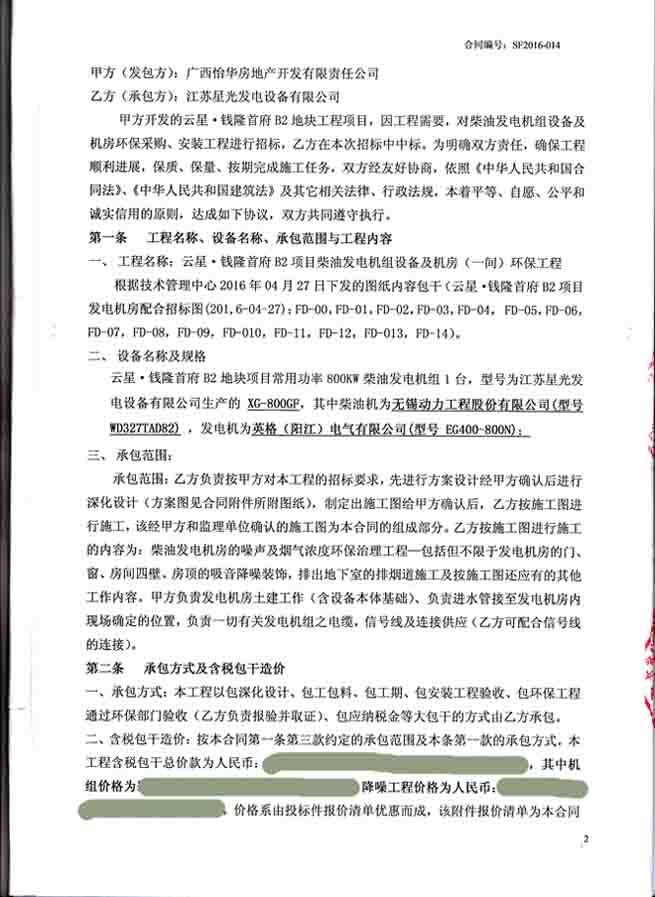 2016年6月29日,我江苏星光动力集团成功与广西怡华房地产开发有限责任公签订云星?钱隆首府B块地(12号楼、13号楼)柴油发电机组设备及机房环保采购、安装工程合同。我公司为其提供发电机组一台并负责机组的运输安装调试等工作,按照工程招标要求进行方案设计,制定施工图并按施工图进行柴油发电机房的噪声及烟气浓度环保治理工程进行施工。