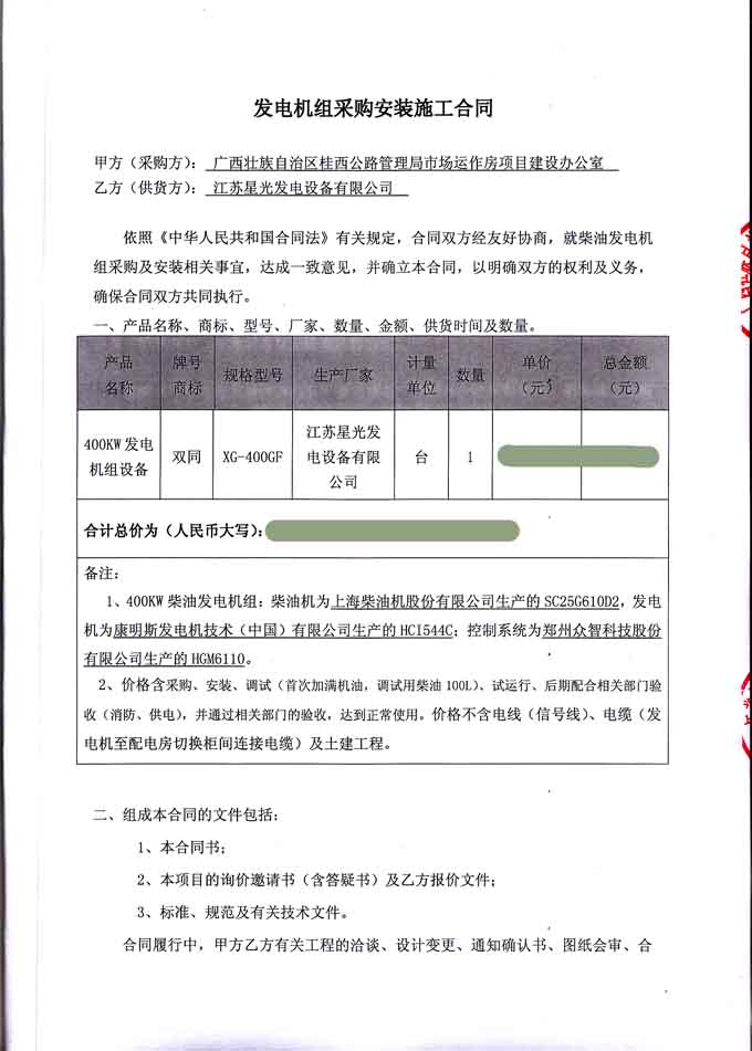2016年6月29日,广西壮族自治区桂西公路管理局市场运作房项目建设办公室与我公司签订发电机组采购安装施工合同,我公司负责提供双同牌400KW发电机组设备一台及机组的安装调试、试运行、后期配合相关部门验收(消防、供电),并通过相关部门的验收,达到正常使用等工作。发电机产品购销合同如下: