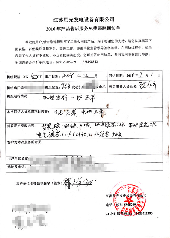 我公司对已购买本公司600kw里卡多发电机的广西百佳华百货有限公司进行售后服务免费跟踪回访,本次回访人员对机组进行一系列的检查维护,未发现机组异常,机组状况运行正常,电压、电表也正常,由于机组已到8年,本公司售后人员建议广西百佳华百货有限公司对发电机部件进行整改,更换机油,更换机油滤芯,更换柴油滤芯,更换空气滤芯及水箱宝。
