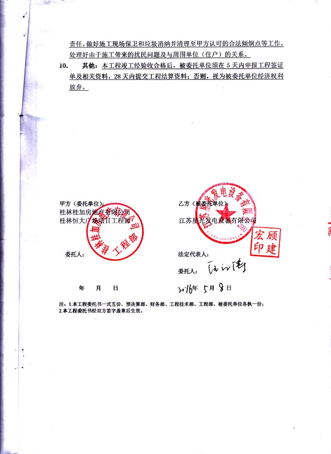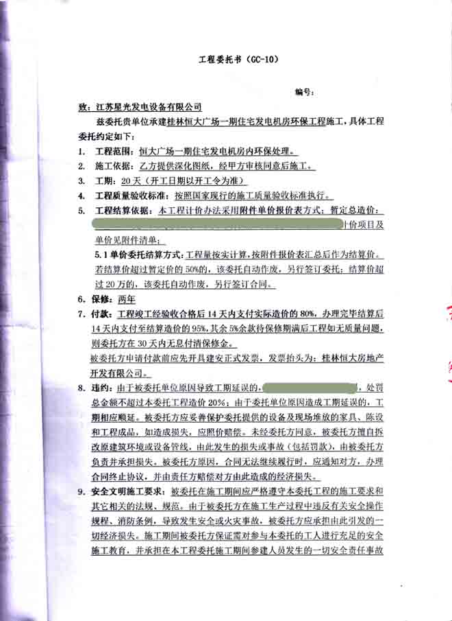 2016年5月8日,桂林桂加房地产有限公司与我公司签订桂林恒大广场一期住宅发电机环保工程委托书,我公司为其提供恒大广场一期住宅发电机房内环保处理。委托书如下: