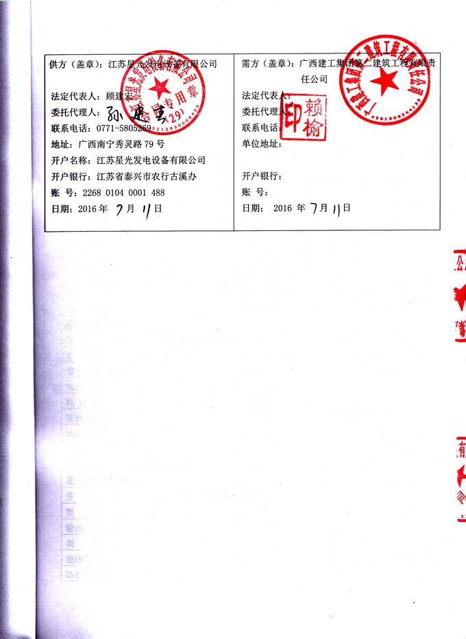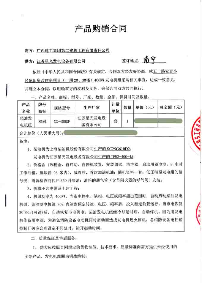 2016年7月11日,广西建工集团第二建筑工程有限责任公司与我江苏星光动力集团签订五一路安泰小区危旧房改住房项目(一期2#、3#楼)400KW发电机组采购合同,我公司为其提供双铜牌XG-400GF柴油发电机组(机组配置为上柴柴油机和星光发电机)一套,并负责机组的运输安装调试及对操作人员的培训工作。发电机产品购销合同如下: