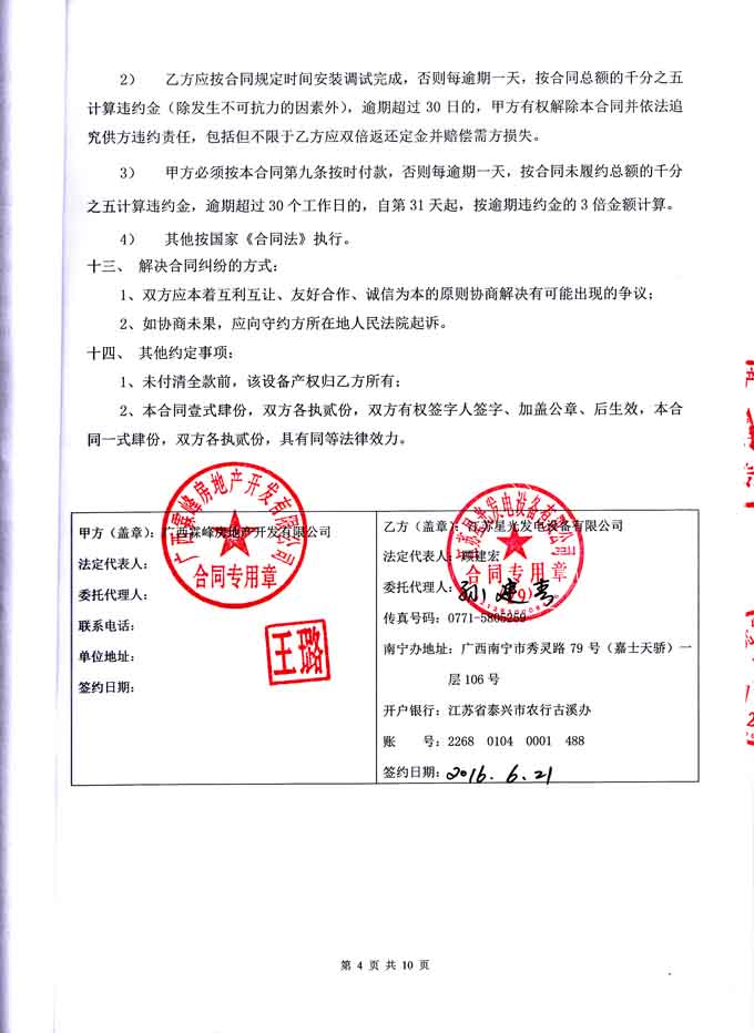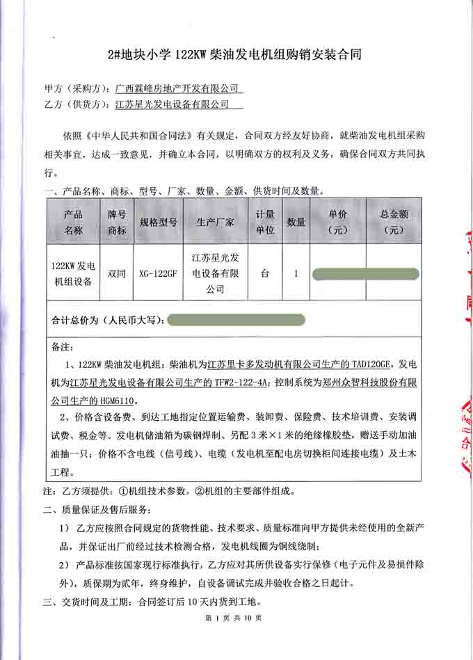 2016年6月21日,广西霖峰房地产开发有限公司与我公司签订2#块地小学 122KW柴油发电机组购销安装合同,我公司为其提供一台里卡多柴油发电机组一台,机组配置为江苏里卡多发动机配星光发电机及郑州众智控制器。发电机产品购销合同如下: