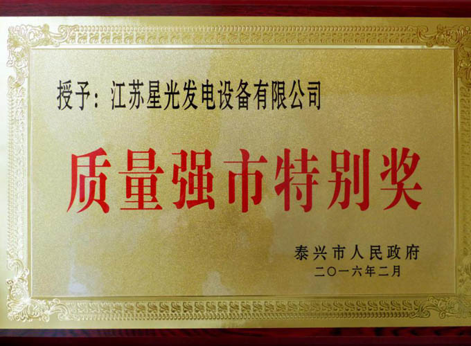 日前,在全市质量提升暨质量强镇(园区、街道)、质量强企、质量强业工作推进大会上,江苏星光发电设备有限公司被授予“质量强市特别奖”。