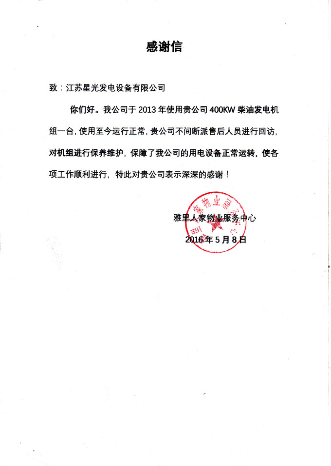 2016年5月8日,我江苏星光动力集团售后人员收到雅里人家物业服务中心的感谢信,对我公司提供的400KW柴油发电机及售后服务反应迅速,上门维修保养服务到位,认真的售后服务工作表示感谢!
