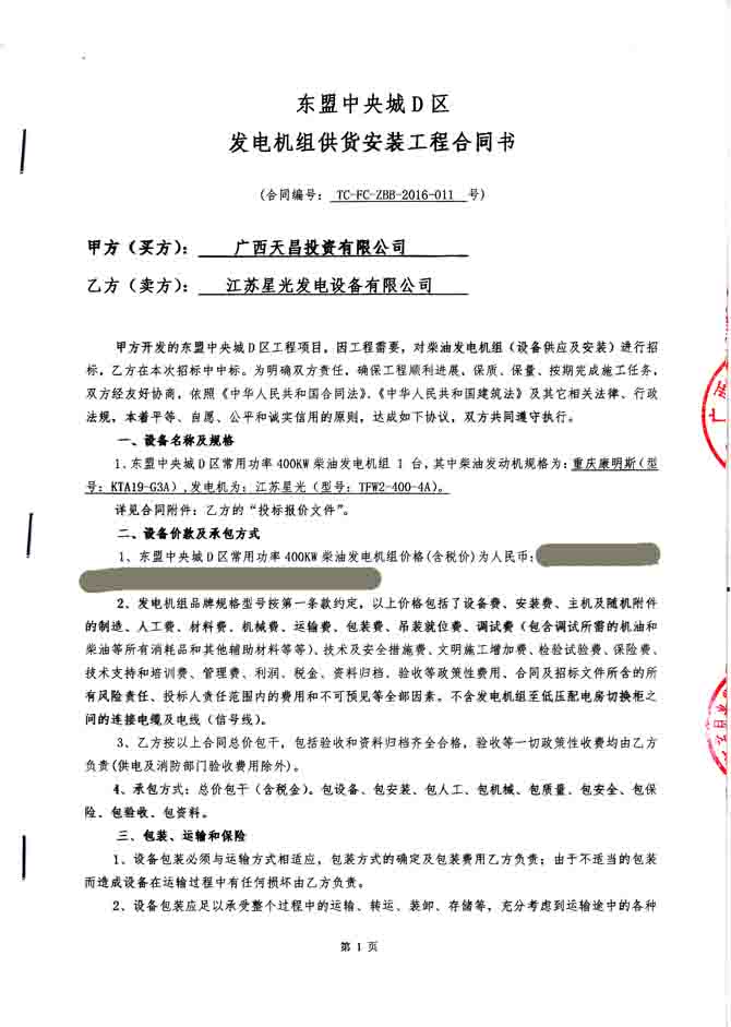 2016年5月18日,我公司自主创新设计生产的节能环保型柴油发电机组借精湛的技术,优良的品质和完善的售后服务成功与广西天昌投资有限公司签订东盟中央城D区发电机组供货安装工程合同,我公司为其提供配置为重庆康明斯发动机配江苏星光发电机的400KW柴油发电机组一台。发电机产品购销合同如下: