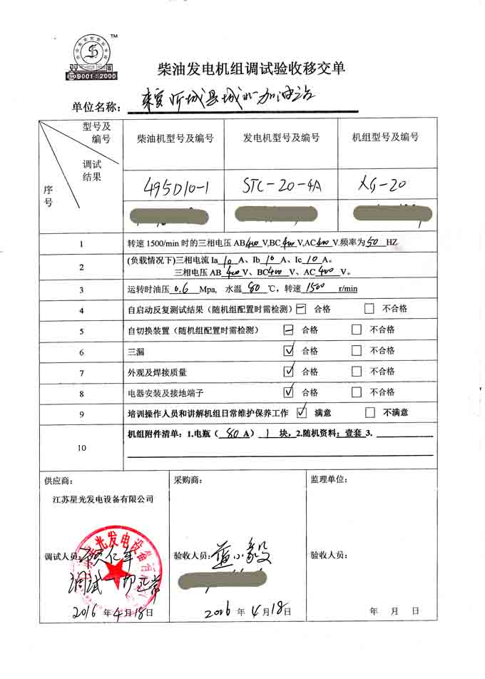2016年4月18日,在来宾忻城城北加油站的发电机组安装现场,我司技术人员对柴油发电机组进行调试交付工作。之前来宾忻城城北加油站成功与我公司签订20KW潍柴柴油发电机采购合同,此刻已经做好安装调试工作,并培训其操作人员和讲解机组日常维护保养注意事项,以下是发电机组调试验收单: