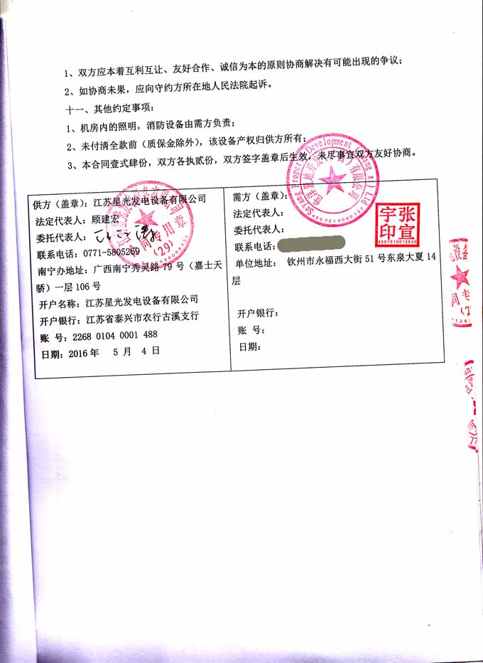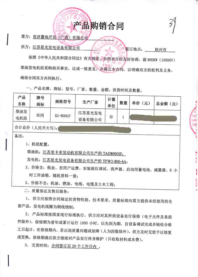 2016年5月4日,我公司成功与世洋置地开发(广西)有限公司签订800KW柴油发电机组产品购销合同,我公司为其提供配置为柴油机:江苏里卡多发动机生产的TAD800GE;发电机:江苏星光发电设备有限公司机生产的TFW2-800-4A的里卡多柴油发电机组一台。发电机产品购销合同如下: