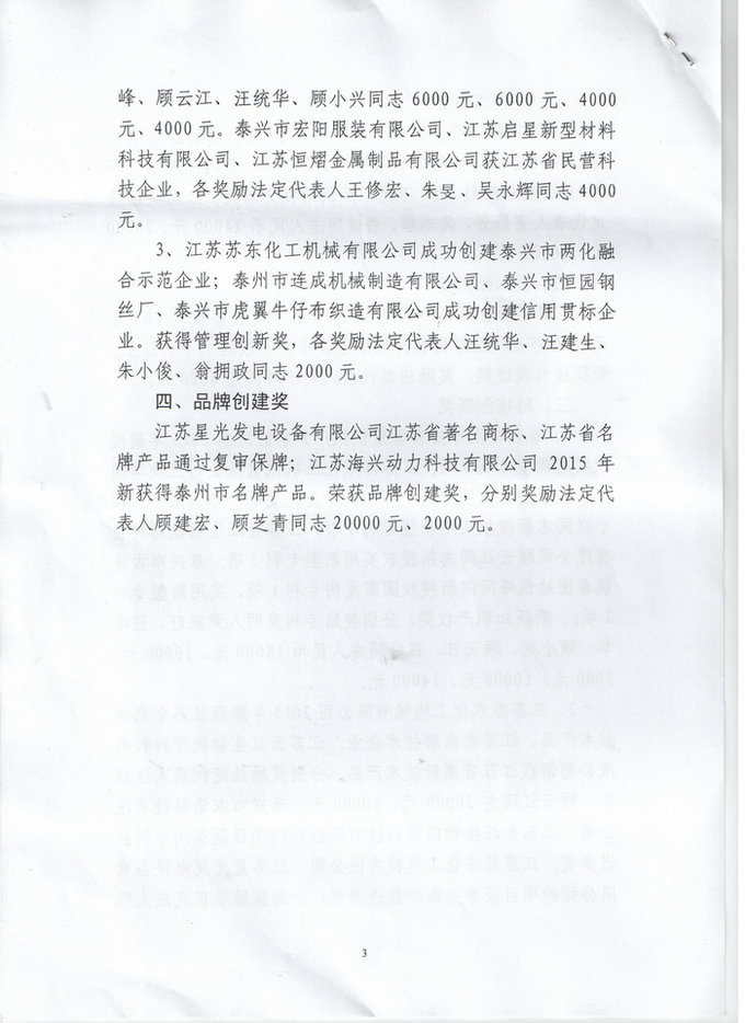 1、江苏星光发电设备有限公司的项目荣获“泰兴市科技进步奖”。