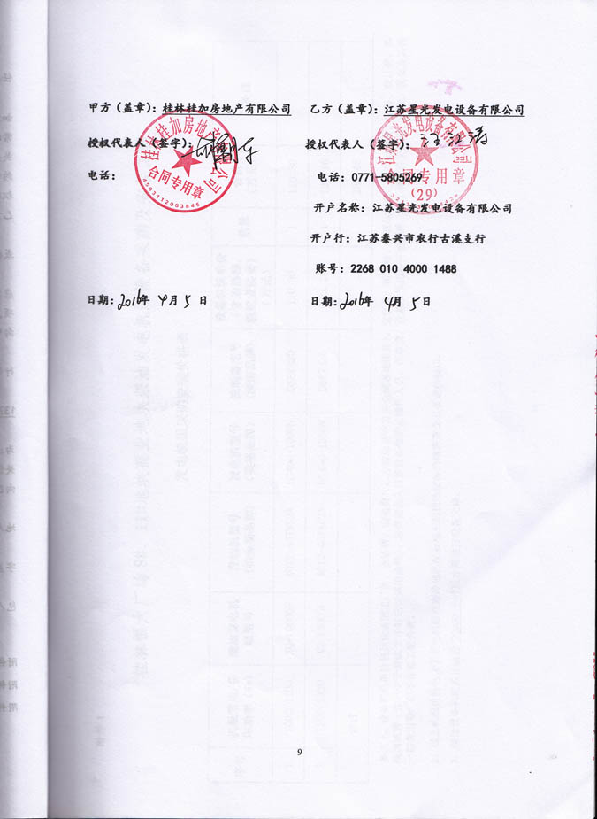 2016年4月5日,我公司发电机产品凭借精湛的技术,优良的品质和完善的售后服务体系,成功与桂林桂加房地产有限公司签订桂林恒大广场8#、11#地块商业地块珀金斯发电机组设备采购及安装工程合同,我公司为其提供1000KW柴油发电机组和1200KW柴油发电机组各一台,机组配置为珀金斯发动机配英格发电机及深??刂破?。发电机产品购销合同如下:
