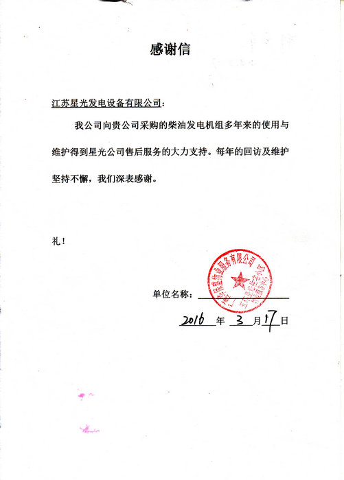 2016年3月17日,我星光公司售后服务人员收到广西华保盛物业服务有限公司五环星光住宅小区物业服务中心的感谢信,对我公司服务反应迅速,上门维修保养柴油发电机组服务到位,认真的售后服务工作表示感谢!