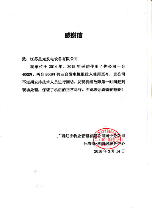 2016年3月14日,我公司收到广西虹宇物业管理有限公司南宁分公司的感谢信,其对我公司提供的一台400KW发电机、两台500KW发电机组三台柴油发电机组的使用及完善的发电机售后服务表示满意,我公司深感荣幸,今后一定更加不懈努力,以更加优质的产品以及更好的售后服务,赢得更多用户的肯定。以下是感谢信扫描件: