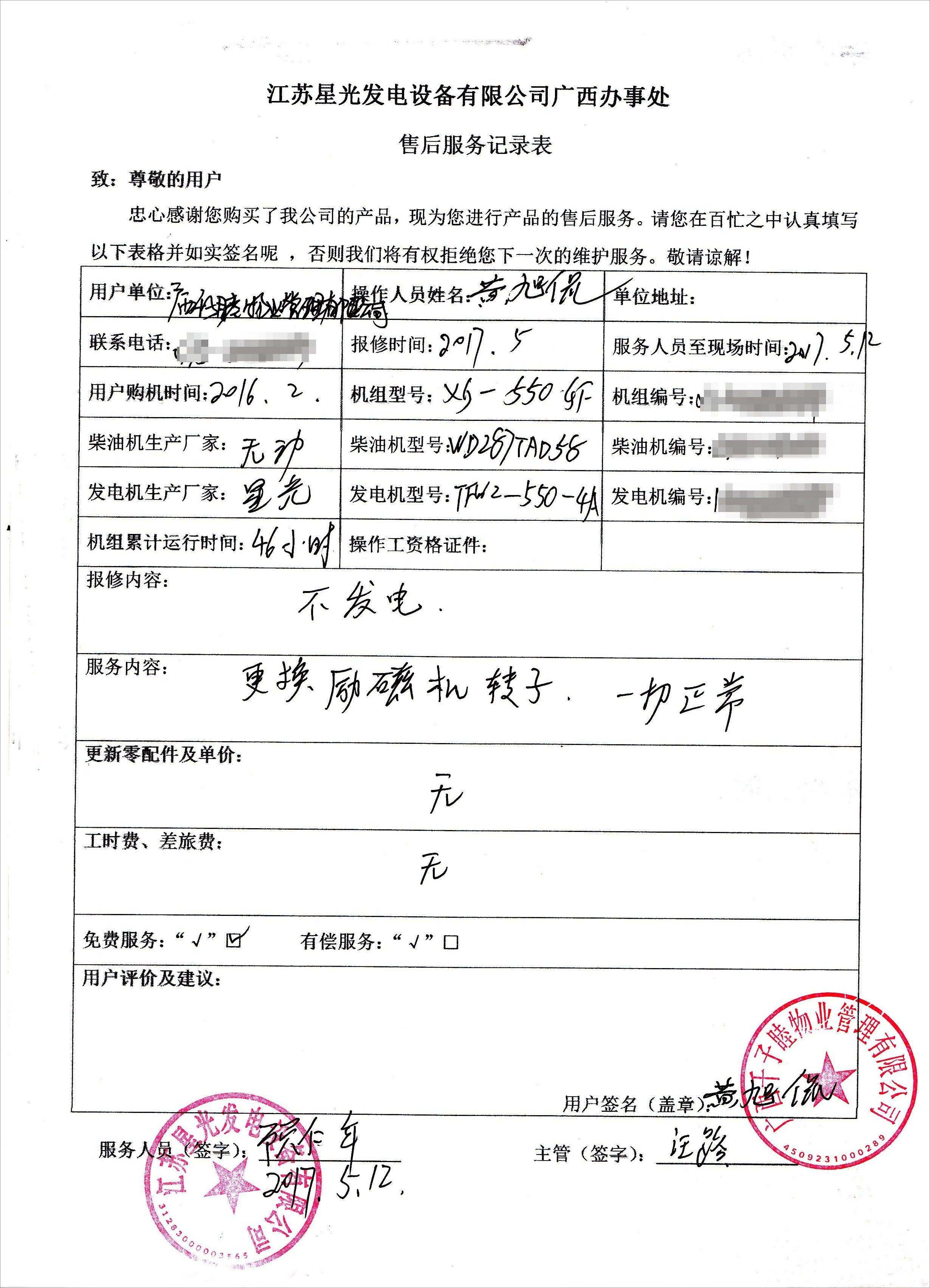 近日,我公司售后服务部接到千子睦物业公司的报修电话。接到故障通知后,售后技术员顾师傅到用户指定现场对这台配置为无动柴油机配星光发电机的550KW无动发电机组进行维保,针对用户反映发电机不发电的问题对机组进行详细检查后更换励磁转子,机组恢复正常运行。
