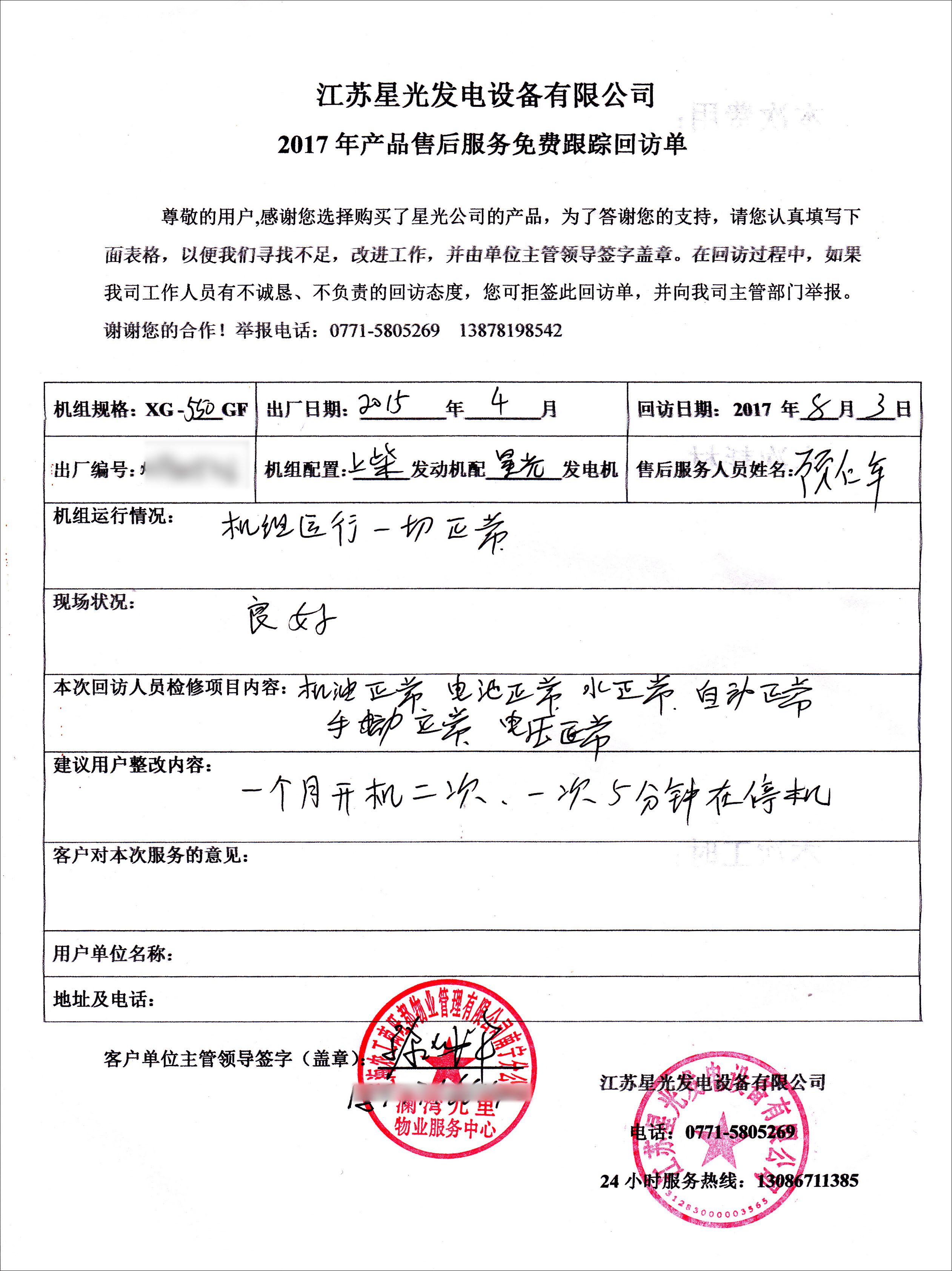 澜湾九里物业于20154月在我公司购买了600KW550KW的上柴发电机组各一台,配置均为上柴发动机配星光发电机。83日,我公司售后技术员顾师傅到澜湾九里对这两台发电机组进行免费售后服务。经检查,机油、水、发电电压均正常,机组自动化、手动均正常。为防止长期不使用的??机组机发生锈蚀和损坏,顾师傅建议一个月开机两次,每次运行5分钟后?;8喙赜?/span>上柴发电机组售后服务欢迎拨打星光热线:13878198542