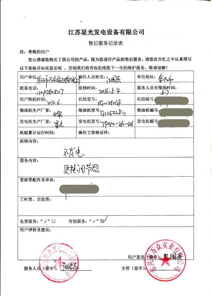 2016年5月7日,我公司就东兴市万众实业有限公司来电报修柴油发电机组不发电的故障安排人员到场检修。经技术人员检查,机组为250KW上柴发电机组,故障原因为调节器损坏,更换调节器后机组运行已一切正常。以下是售后服务记录表: