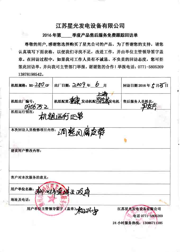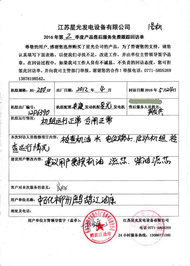 2016年5月24日,我星光动力售后服务人员到中石化柳州鹧鸪江油库,对其向我公司购买的两台200KW柴油发电机组(机组配置为东风康明斯柴油机配星光发电机)进行免费回访。本次回访主要检查机组的机油、水箱水、电位端子等部件,并启动机组检查机组运行状况,其中一台运行正常,一台正常启动后升不了高速,电压达不到并机要求,技术人员及时处理,最后建议用户及时更换损坏部件,做好机组保养,以保障机组的正常运行及延长使用寿命。下面是本次回访记录:
