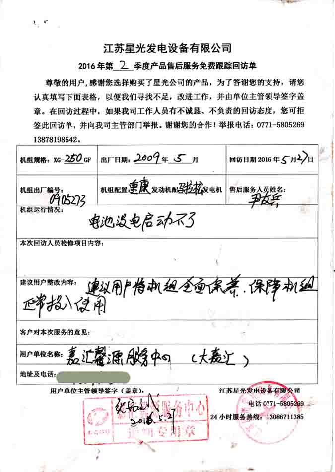 2016年5月27日,我星光售后技术人员到嘉汇馨源服务中心,对其向我公司购买250KW柴油发电机组(机组配置为重庆康明斯柴油机配上海马拉松发电机)进行免费回访。技术人员经检查发现机组电池没有电不能启动,针对机组出现的问题,技术人员建议用户对机组进行全面保养,以保障机组正常投入使用。下面是本次回访记录: