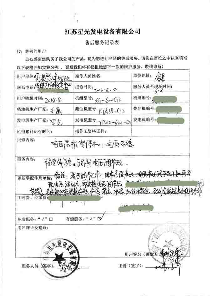 2016年6月8日,我江苏星光动力集团的售后服务人员到富盛广场发电机房,就广西容县登峰物业管理有限公司向我公司购买的600KW重庆康明斯发电机组报修的电压不稳,电压高报警停机故障进行检修。经检修机组运行已一切正常。以下是售后服务记录表: