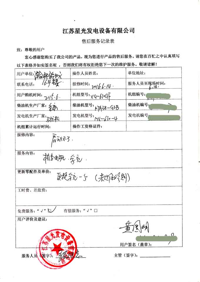 2016年6月14日,我公司售后服务部接到翰林锦城16#楼管理中心的报修电话,及时安排技术人员与其对接,到现场就报修的发电机组启动不了情况进行检修。经检查该机组为重庆康明斯柴油机配马拉松发电机的630KW柴油发电机组,技术人员检查了机组电瓶及孚充,发现为是孚充引起的故障,为用户更换孚充,机组运行已一切正常。以下是售后服务记录表: