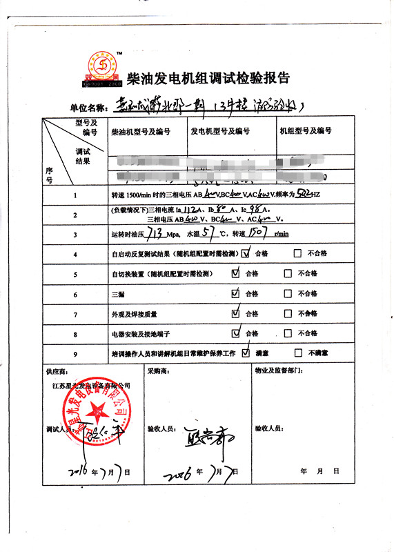 2016年7月7日,我公司工作人员直达南宁嘉和城现场指挥安装调试一台640KW柴油发电机,调试结果为:自启动反复测试结果合格,自切换装置合格,三漏合格,外观及焊接质量合格,电器安装及接地端子合格。此外,我公司工作人员还对嘉和城北郡一期的操作人员进行了培训以及讲解机组日常的维护保养工作,该公司对此非常满意。