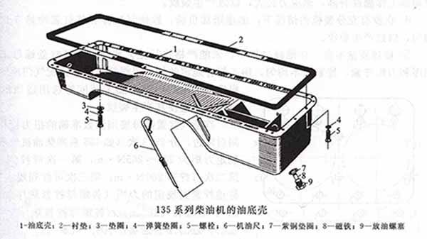 油底壳的结构开关主要是根据机油的容量、柴油机的安装位置以及在使用中的纵横倾斜角度来决定。下图为135系列柴油机的油底壳,为了保证润滑油泵能经常吸油,其后部较深,整个底部呈斜面以保证供油充足。对于热负荷圈套的柴油机,油底壳带有散热片以降低机油的温度。为防止润滑油激溅,油底壳中多设有挡油板。油底壳底部装有磁性放油塞,以吸附润滑油中的铁屑和必要时放出润滑油。