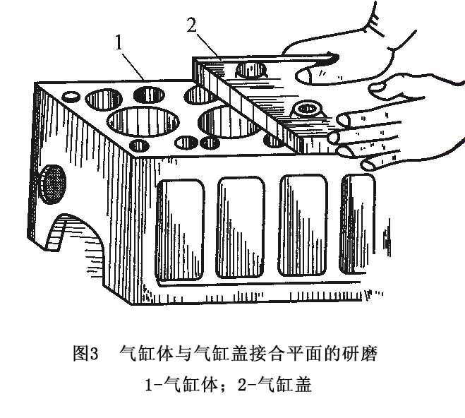 3、气缸体和气缸盖不平也可以用铲刀铲平或涂上研磨膏,把气缸盖放在气缸体上扣合研磨,如图3所示。