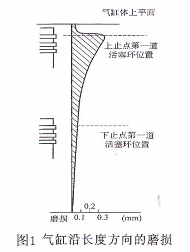 1、沿长度方向成“锥形”,图1是气缸沿长度方向磨损示意图,图中的阴影部分表示磨损量,由图可知:在活塞环运动区域内磨损较大;这种磨损是不均匀的,上重下轻,使气缸沿长度方向成“锥形”;其最大磨损发生在活塞处于上止点时,与第一道活塞环相对的气缸壁稍下处;最小的磨损发生在气缸的最下部,即活塞行程以外的气缸壁。