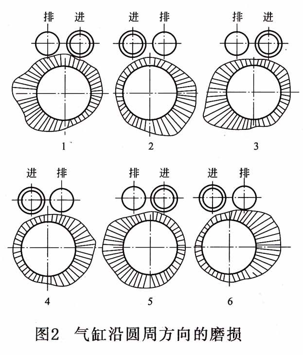 2、沿圆周方向“失圆”。气缸沿圆周方向的磨损规律如图2所示。正常情况下,沿圆周方向的磨损也不均匀,有的方向磨损较大,有的方向磨损较小,使气缸横断面呈失圆状态,在通常情况下,气缸横断面磨损最大部位是:与进气门相对的气缸壁附近以及沿连杆摆方向的气缸壁两侧。