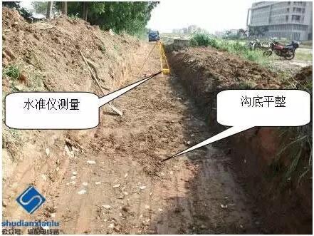 (2)电缆壕沟开挖后,沟底应平整,深浅一致。沟底有一层良好的土层,防止石块或异物凸起。沟壁要有防止坍塌的措施。