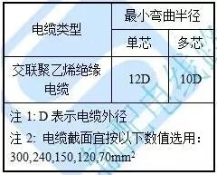 (2)电缆路径的上下左右转向部位,均应满足电缆允许弯曲半径要求。如下表所示。