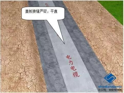 (3)电缆应敷设于壕沟里,并应沿电缆全长的上、下紧邻侧铺以厚度不小于100mm厚的细砂。沿电缆全长应覆盖宽度不小于电缆两侧各50mm的?;ぐ?,?;ぐ逡瞬捎酶纸罨炷?,厚度不小于60mm。