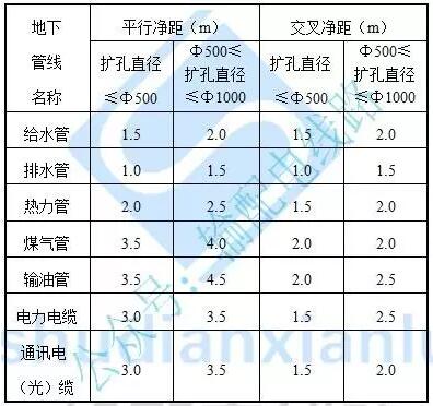 (4)每3m的导向管在地面下的下降深度控制不宜超过1.2~1.5m。导向钻孔轨迹与既有地下管线的最小安全距离见下表。