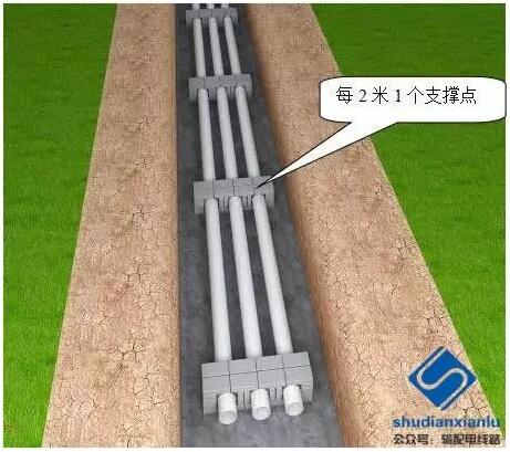 b)铺设电缆管必须保持平直,并列敷设的电缆管管口应排列整齐,每隔2米采用管枕对电缆管进行卡位和固定。如需避让障碍物时,可做成圆弧状排管,但圆弧半径不得小于12m;如使用硬质管,则在两管镶接处的折角不得大于2.5 o。