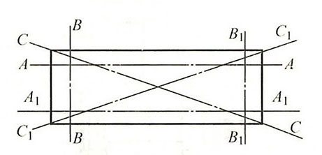 检验壳(盖)结合面的平面度,可按如下图所示的方法测量。即将长于被测件平面的直尺边缘,逐一沿测量线AA、A1A1、BB、B1B1、CC、C1C1放置,并且用厚薄规测量直尺边缘与被测件平面之间的间隙,以确定被测件结合面的平面度。也可将两个互相结合的零件(如气缸体与气缸盖)扣合在一起,用厚薄规测量其间的间隙,以确定被测件结合平面的平面度。