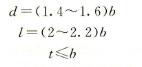 波形键设计和制作时,通常将波形键(图2-18)的凸缘直径d、宽度b)、间距l(波形槽间距t)规定成标准尺寸,根据机件受力大小和铸件壁厚决定波形键的凸缘个数、每个断裂部位安装波形键数和波形槽间距等。一般取b为3~6mm,其他尺寸可按下列经验公式计算: